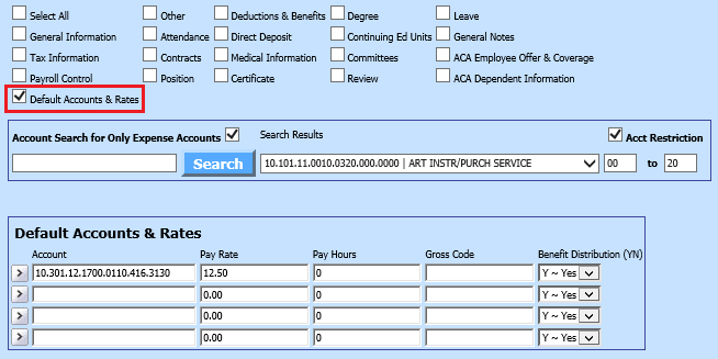 You can Search the salary accounts to expense by typing in the account number or account description in the Search field. If you have the Default Accounts and Rates completed, these will be available to use in the Payroll Processing.