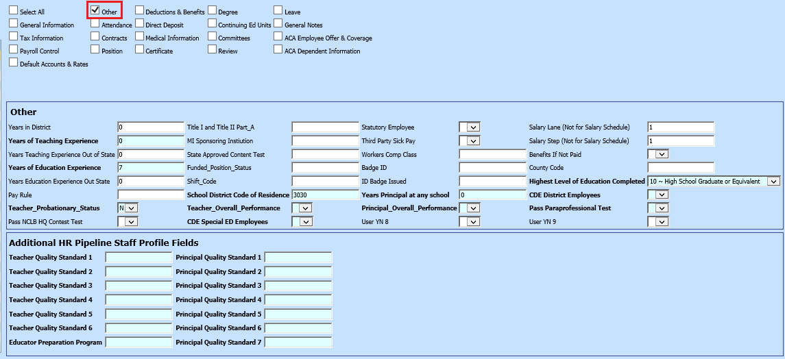 The Other entry view is used for additional Employee data needed for State specific reporting.