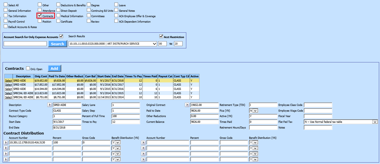 The Contracts view is where you can add new employee contracts and view and adjust Current and Historical Employee contracts.