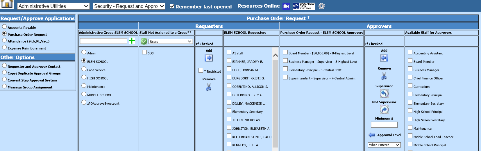To assign the Approvers: Under Available for Staff for Approvers, select the Users and use the Add