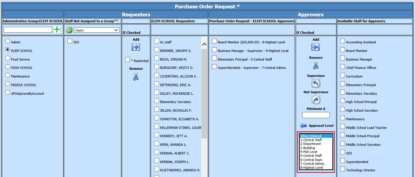 A Supervisor Approver will override any other Approver. They may approve or deny any request available to them. To assign a Supervisor Approver to your selected “Elementary Approvers”, check the box next to the users name and select the